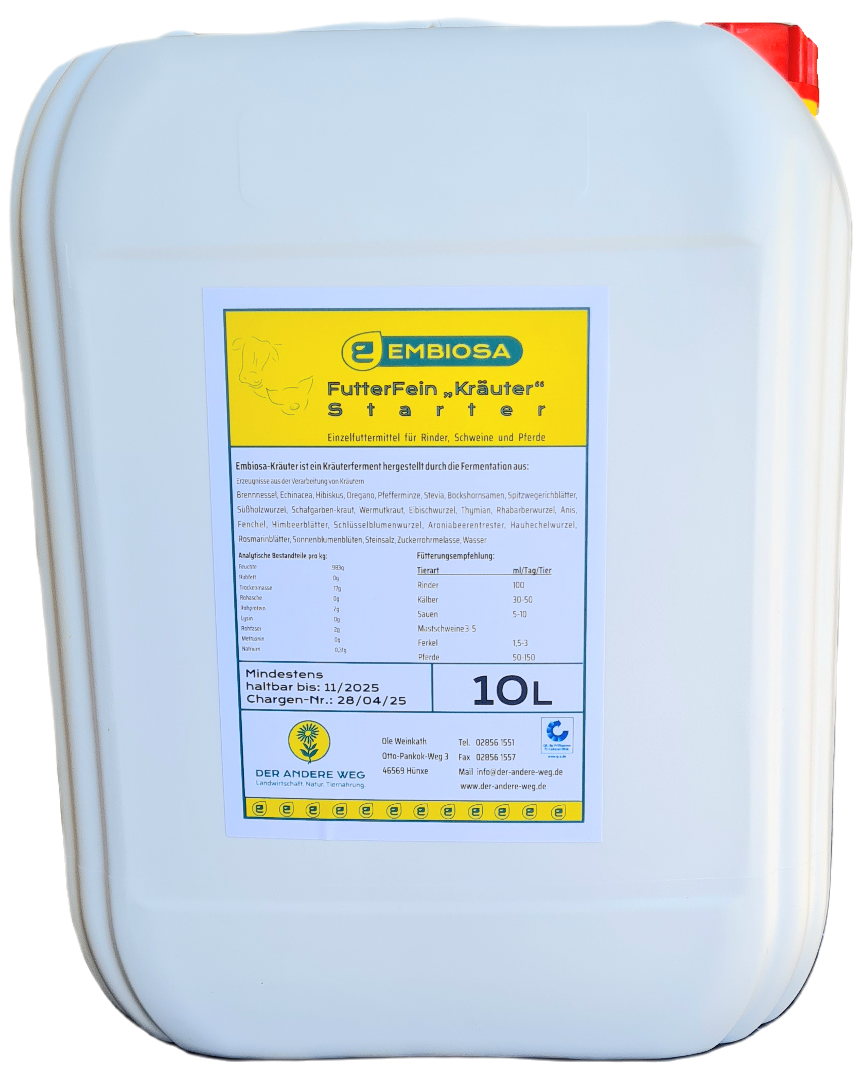 Mit Hilfe von EMbiosa-FutterFein (Kräuter)-Starter können Sie auch selbst größere Mengen des gebrauchsfertigen EMbiosa-FutterFein (Kräuter) herstellen.