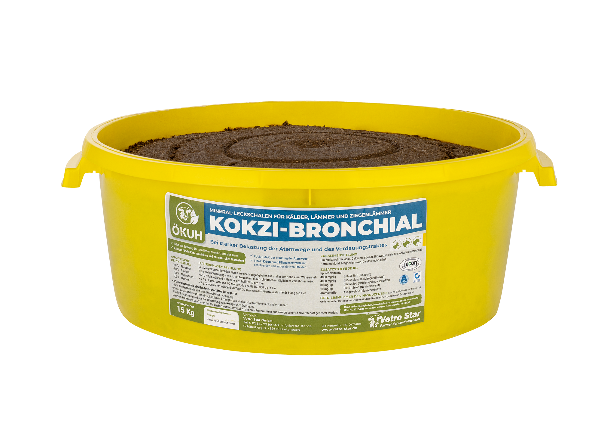 Mineral-Leckschale für Kälber, Lämmer und Ziegenlämmer. Bei starker Belastung der Atemwege und Kokzidien mit PULMO-MAX und I-MAX Pflanzenextrakten.